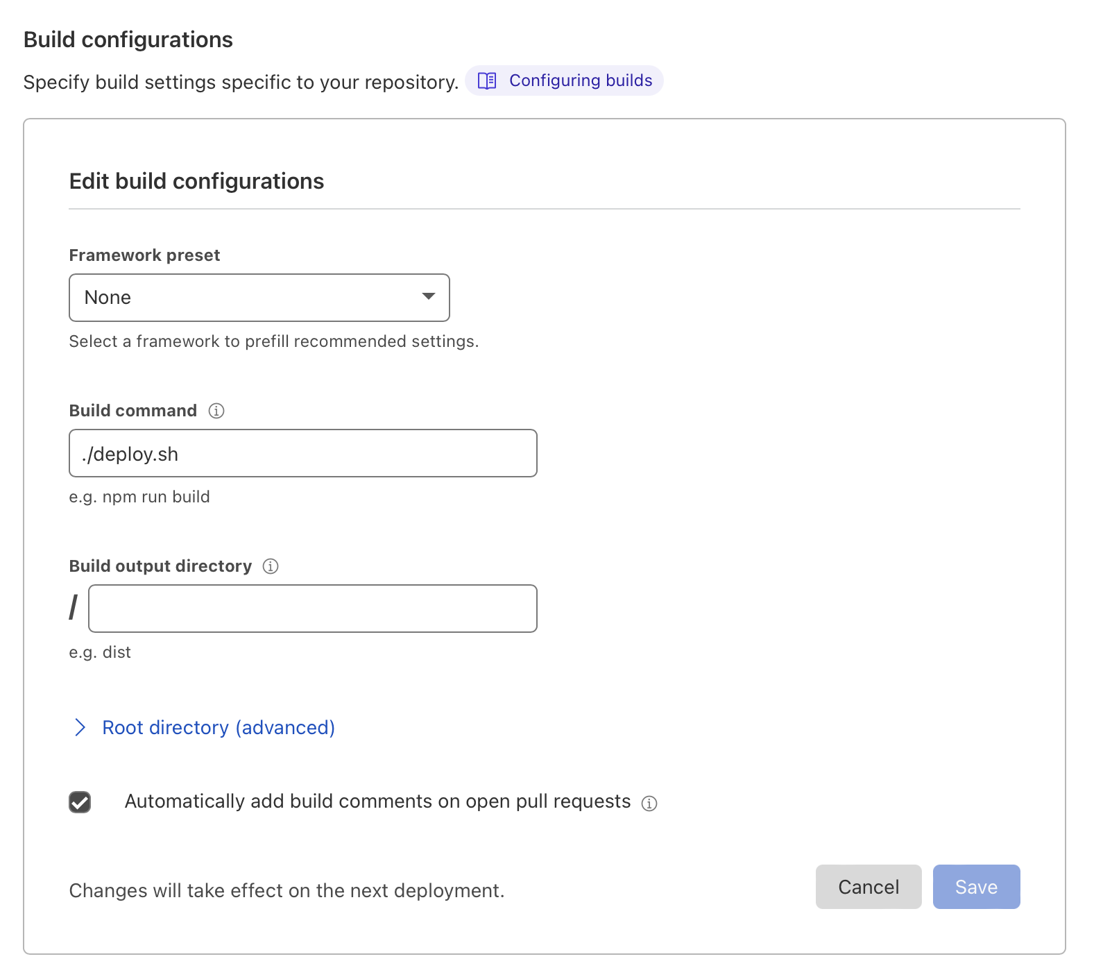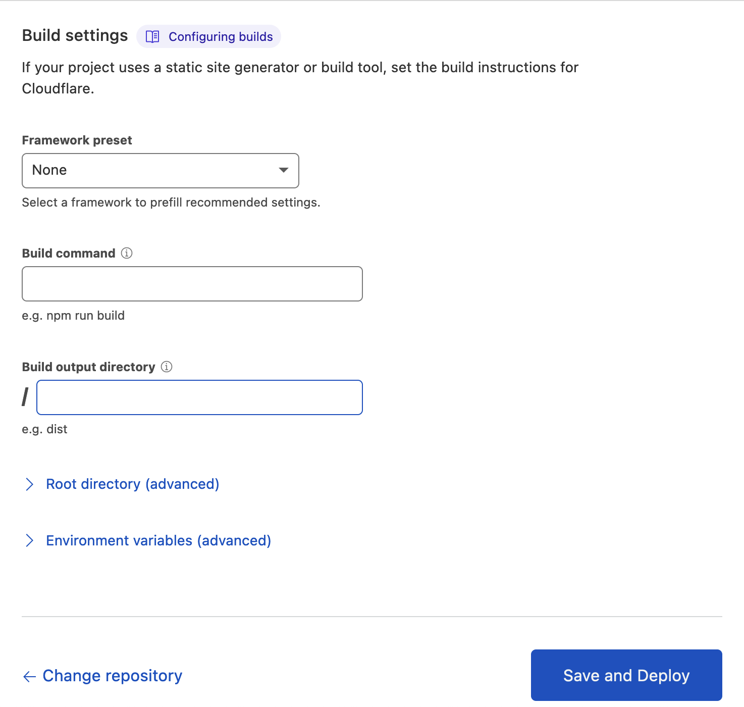 Build output directory – this is where Cloudflare will expect a fully built set of static assets your site consists of. By default it's root folder, and we won't change this.