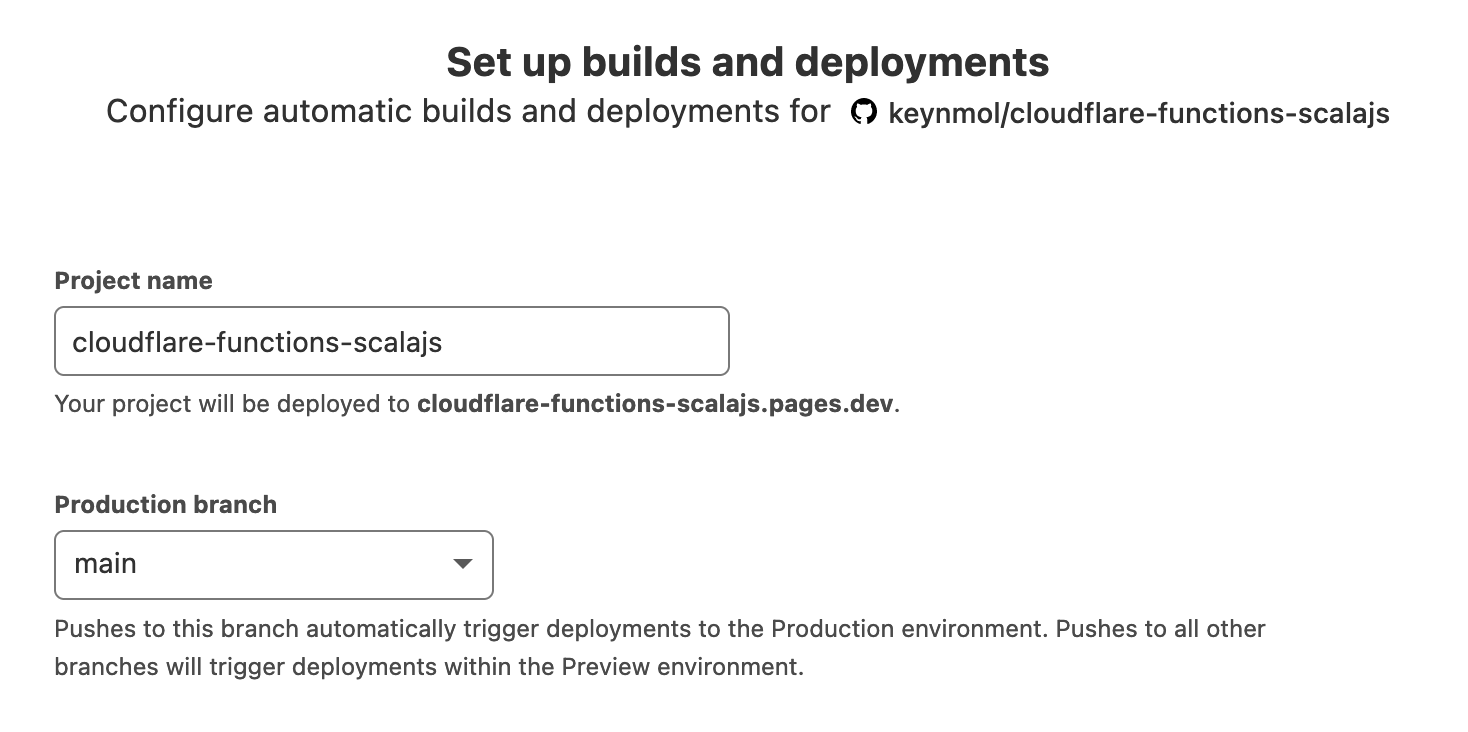 .jsfile, the build process will run on Cloudflare's infrastructure.Other branches will be designated for preview environments.