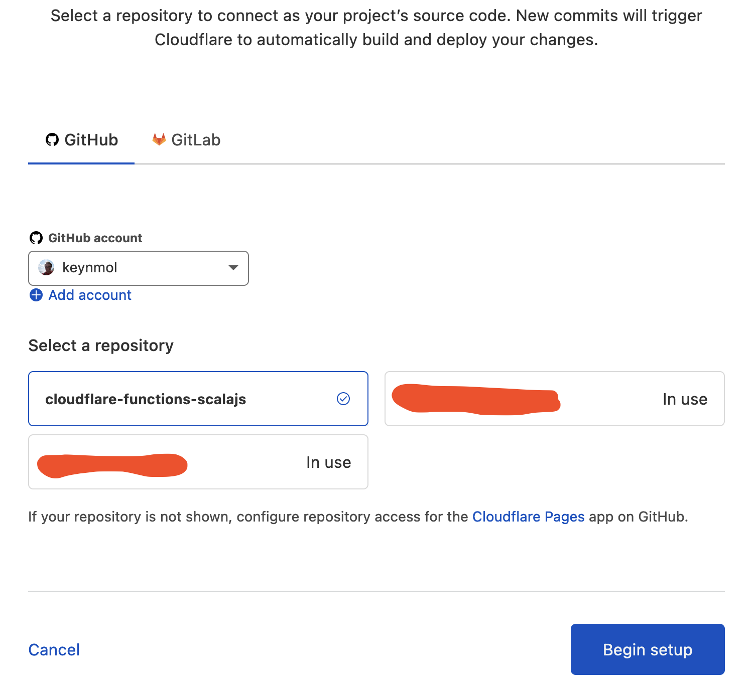 You can configure which repositories the app has access to, which then makes them appear in Cloudflare interface.