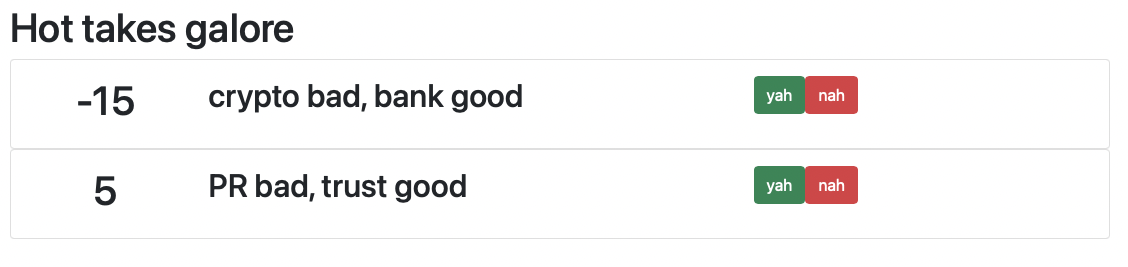 Which, with added Bootstrap magic, will render each hot take as a card like this: