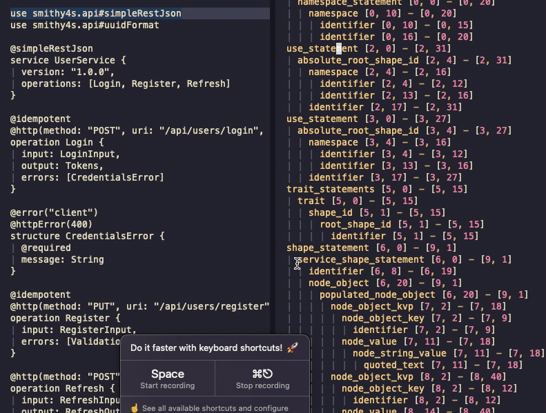 To provide syntax highlighting for Smithy files, we will go at it using what I can only assume is the "blessed" way - creating a Tree Sitter parser grammar and providing highlighting rules.